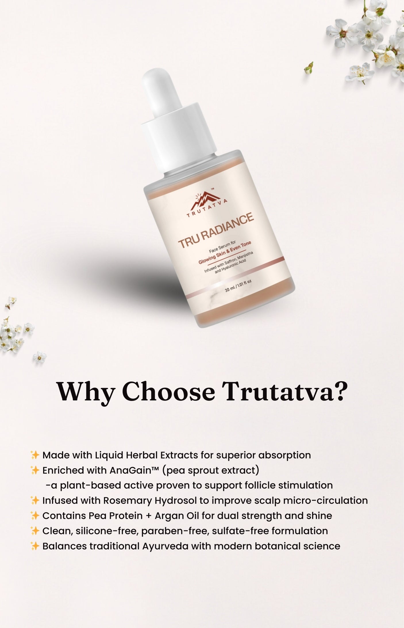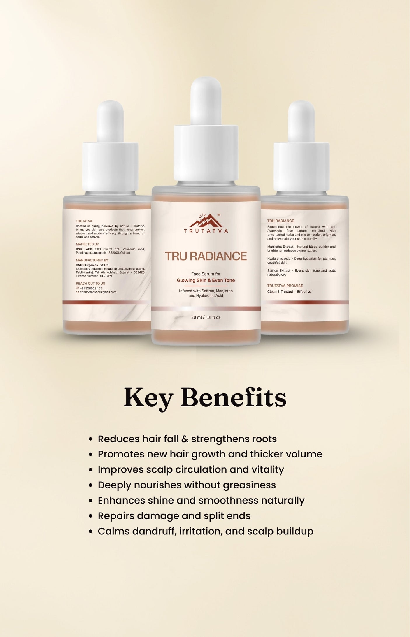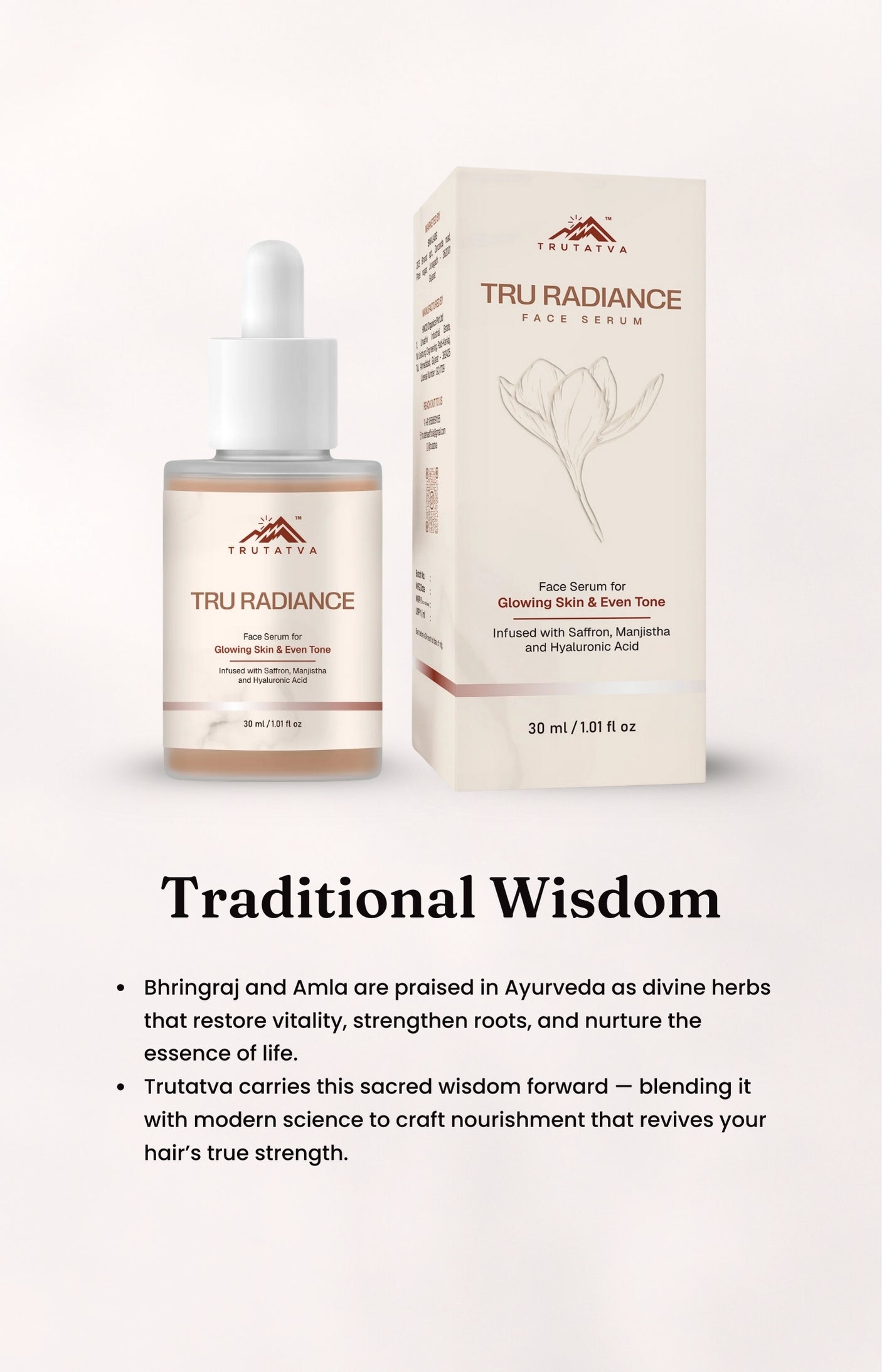 Tru Radiance is a luxury Ayurvedic face serum crafted to target pigmentation, uneven skin tone, and dullness. Blending traditional Ayurvedic herbs with modern skin science, it delivers deep nourishment while restoring natural glow.
