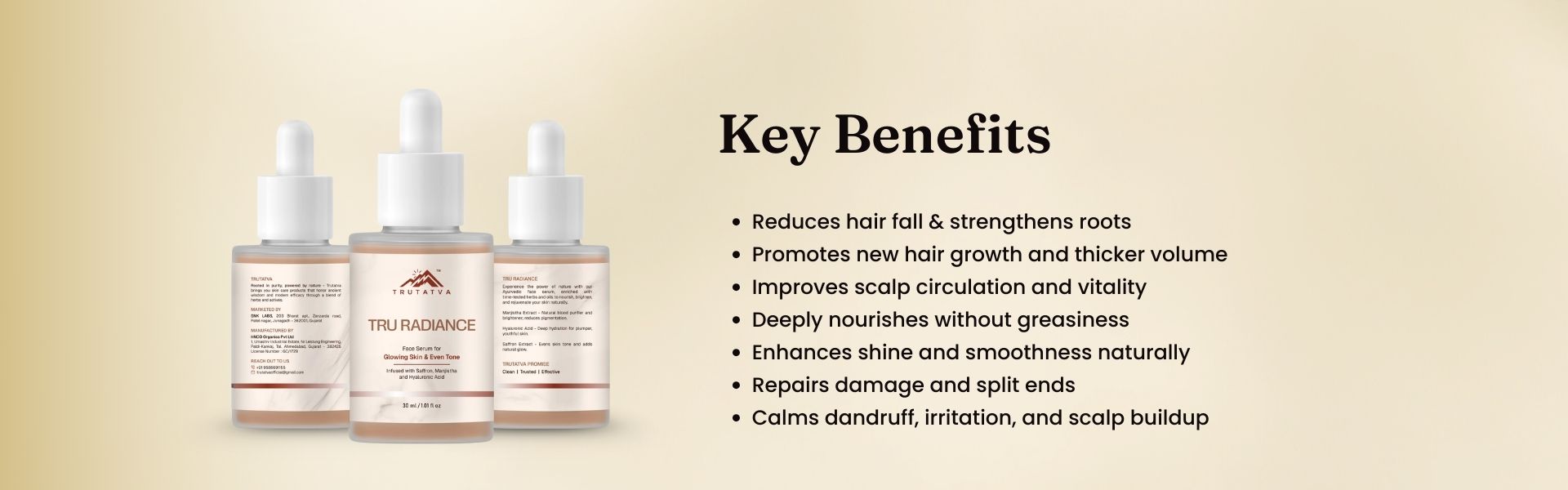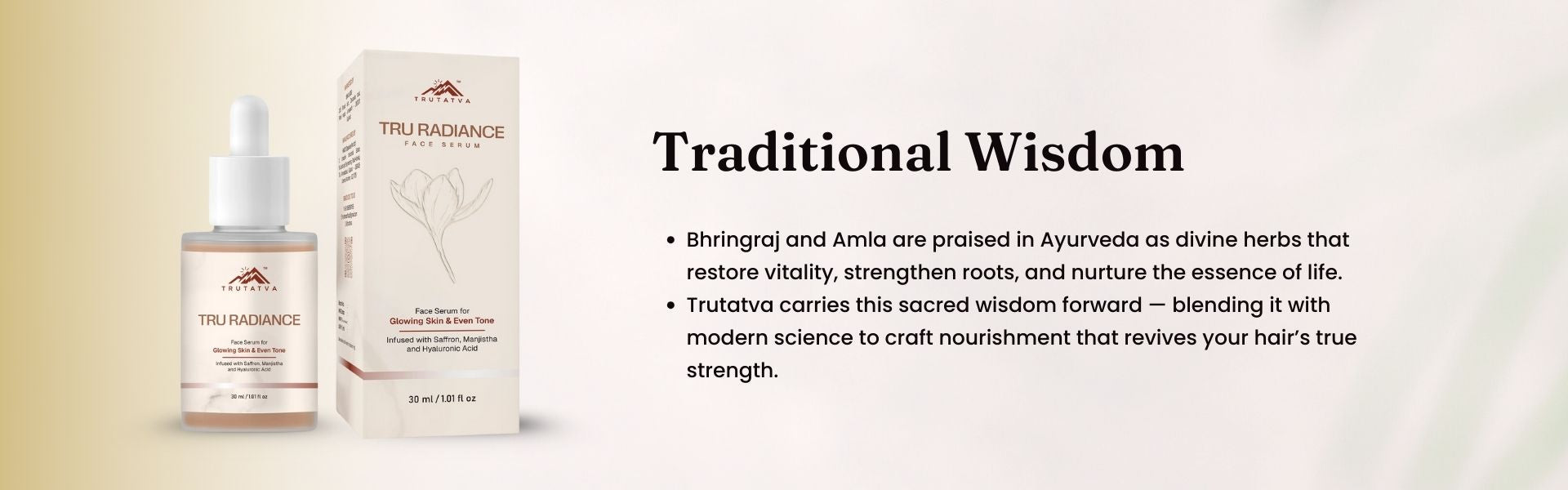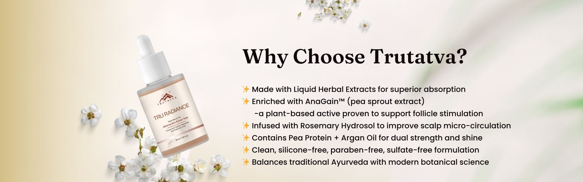 Tru Radiance is a luxury Ayurvedic face serum crafted to target pigmentation, uneven skin tone, and dullness. Blending traditional Ayurvedic herbs with modern skin science, it delivers deep nourishment while restoring natural glow.