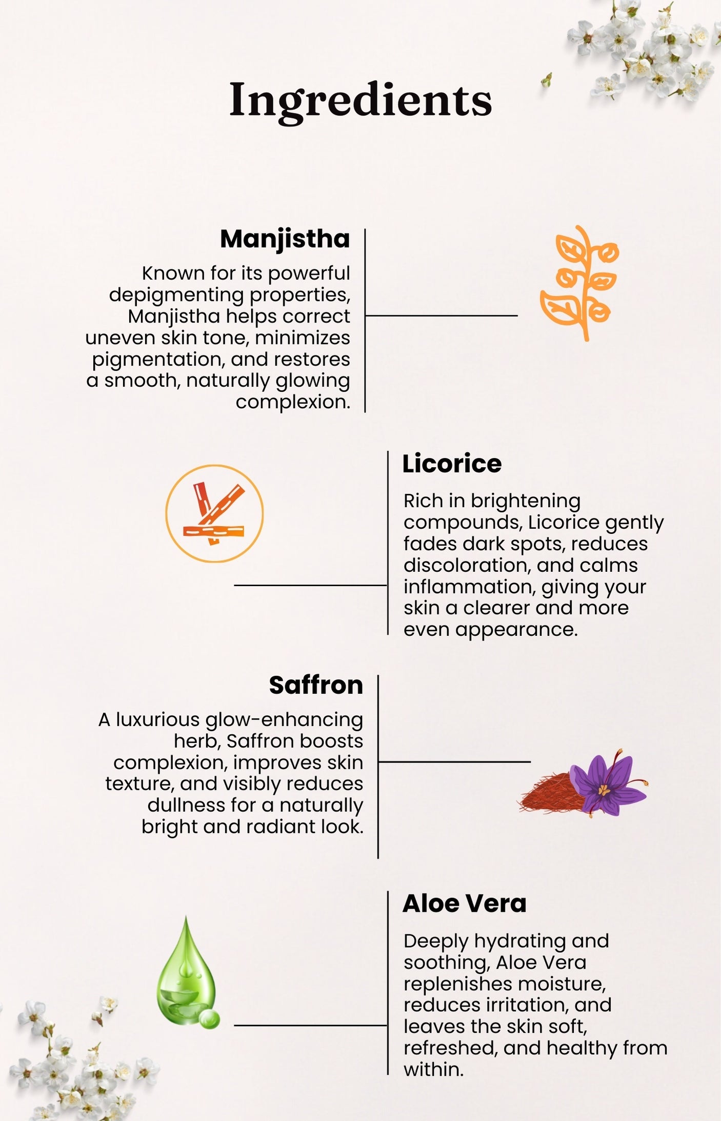 🌸 Reduces Pigmentation & Dark Spots – Manjistha & Licorice naturally correct uneven skin tone ✨ Boosts Natural Glow – Saffron & Aloe restore skin’s radiance 💧 Deep Hydration – Lightweight yet nourishing formula for smooth skin 🌿 Fights Acne & Blemishes – Neem purifies skin and prevents breakouts 🛡 Protects from Environmental Stressors – Herbal antioxidants defend against damage 🧘 Balances Pitta (Heat) in Skin – Prevents dullness, redness & blemishes