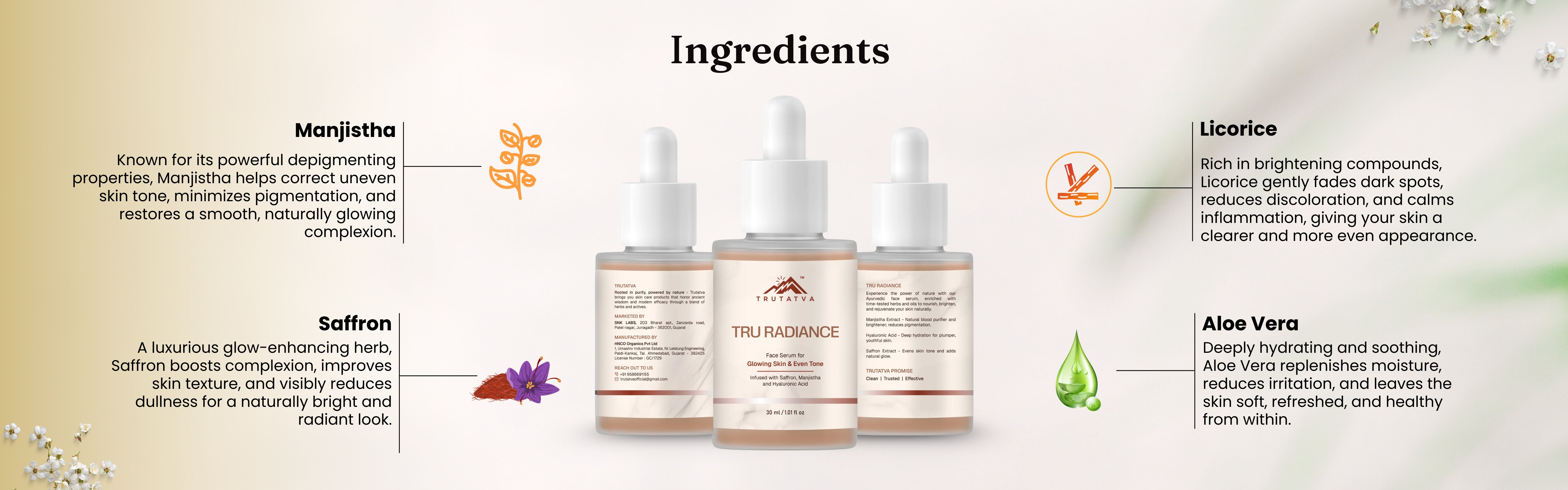 Infused with Manjistha, Saffron, Licorice, Aloe Vera, and Neem, this lightweight serum reduces dark spots, balances complexion, and leaves skin soft, radiant, and youthful. With no harsh chemicals, parabens, or silicones, Tru Radiance is safe for daily use and suitable for all skin types.