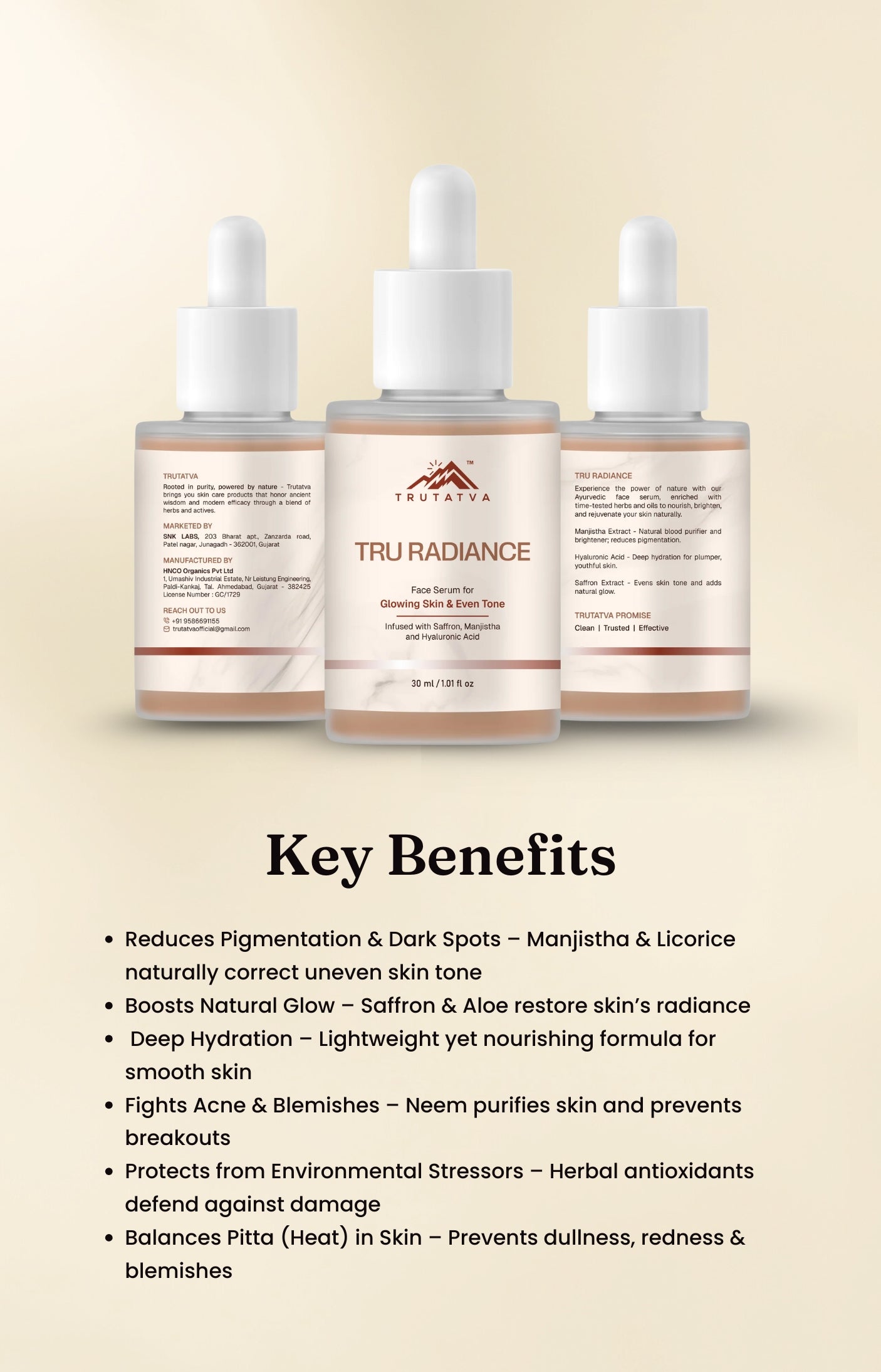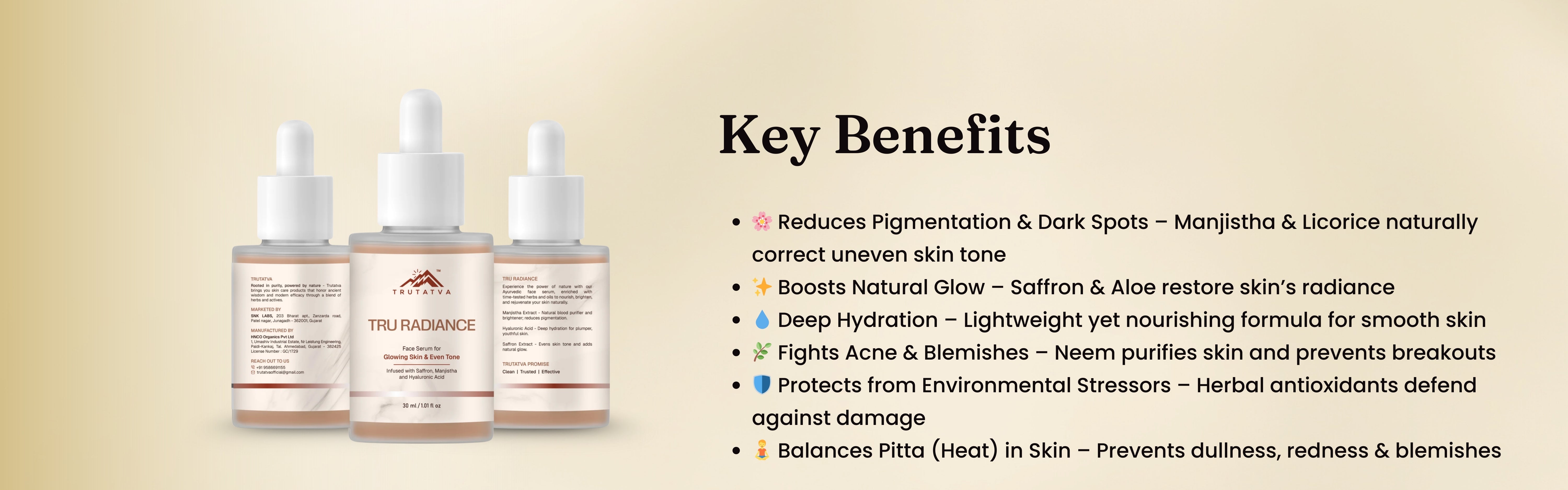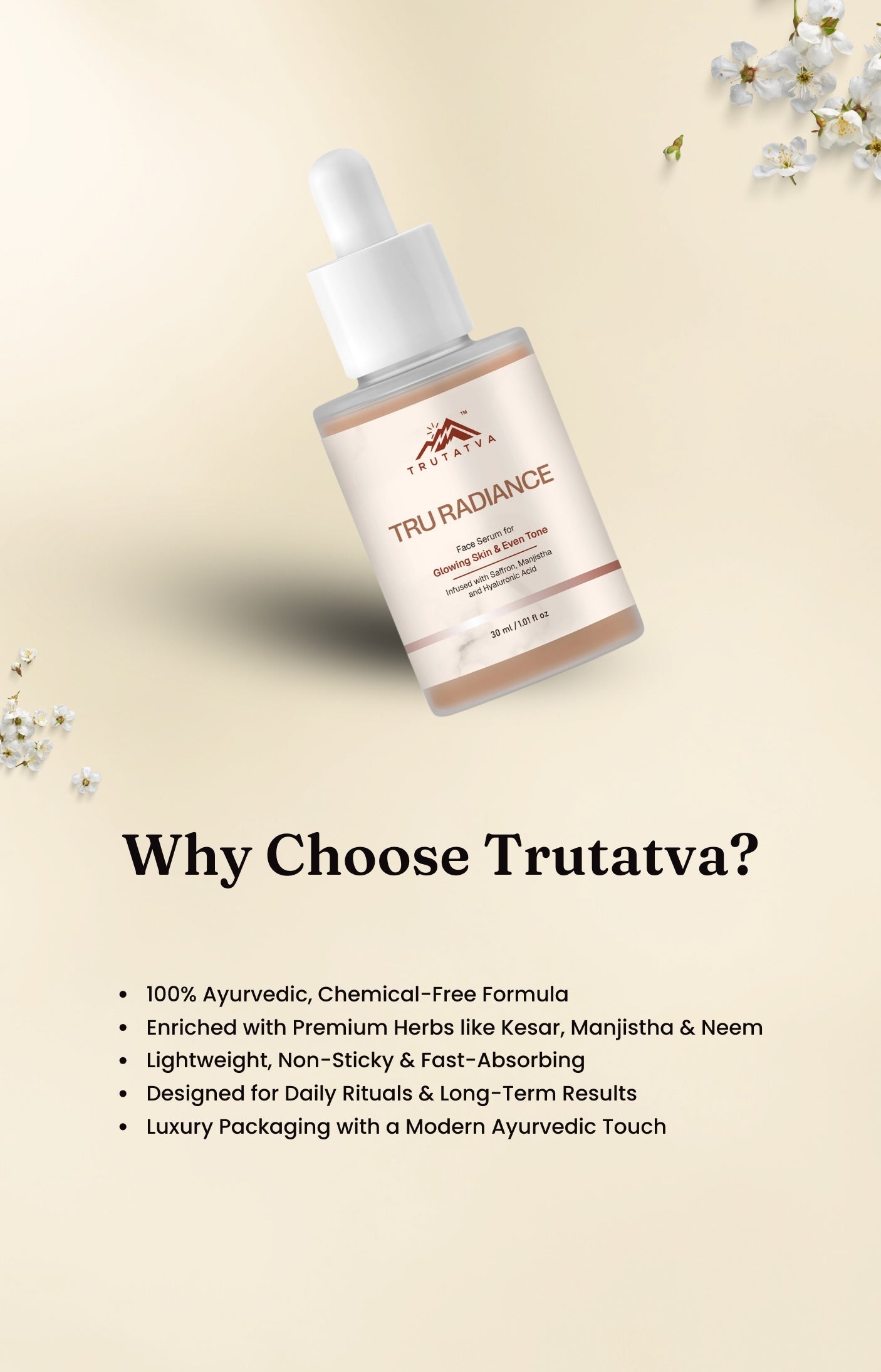 Tru Radiance is a luxury Ayurvedic face serum crafted to target pigmentation, uneven skin tone, and dullness. Blending traditional Ayurvedic herbs with modern skin science, it delivers deep nourishment while restoring natural glow.